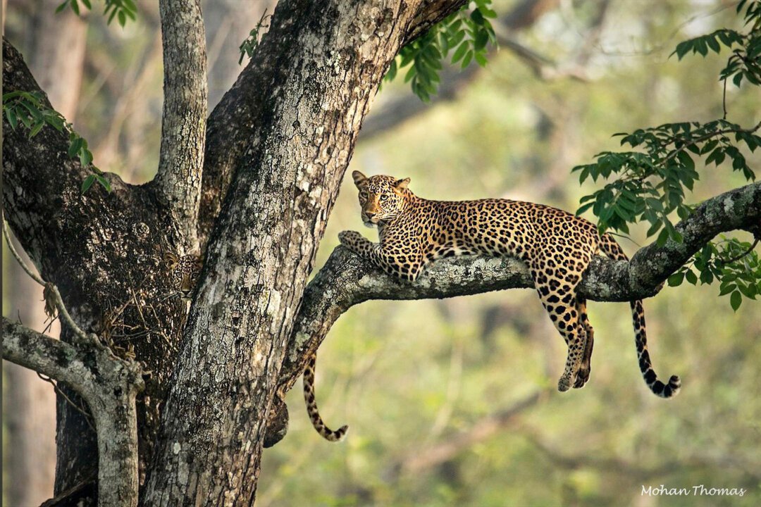 A wildlife photographer from Bangalore, India, was on a trip with his son, when they spotted a hidden leopard hanging from a tree with its mother.