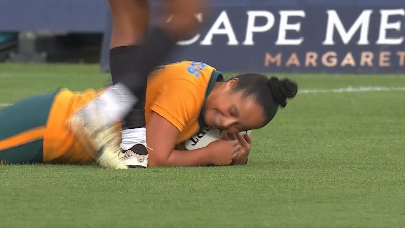 Nicole Ledington scores a try in her Wallaroos debut against Fiji.